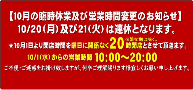 10/20(月)21(火)は誠に勝手ながら臨時休業(連休)
