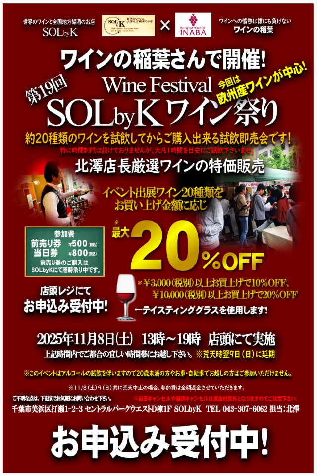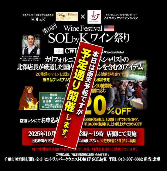 ワイン祭りは予定通り13時~19時まで開催致します!